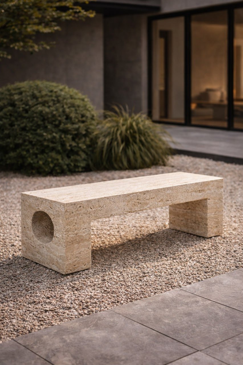 Banca con diseño asimétrico: un lado sólido con perforación circular decorativa y otro lado con base abierta. Tallada en travertino natural. Pieza única que combina funcionalidad con arte escultórico.