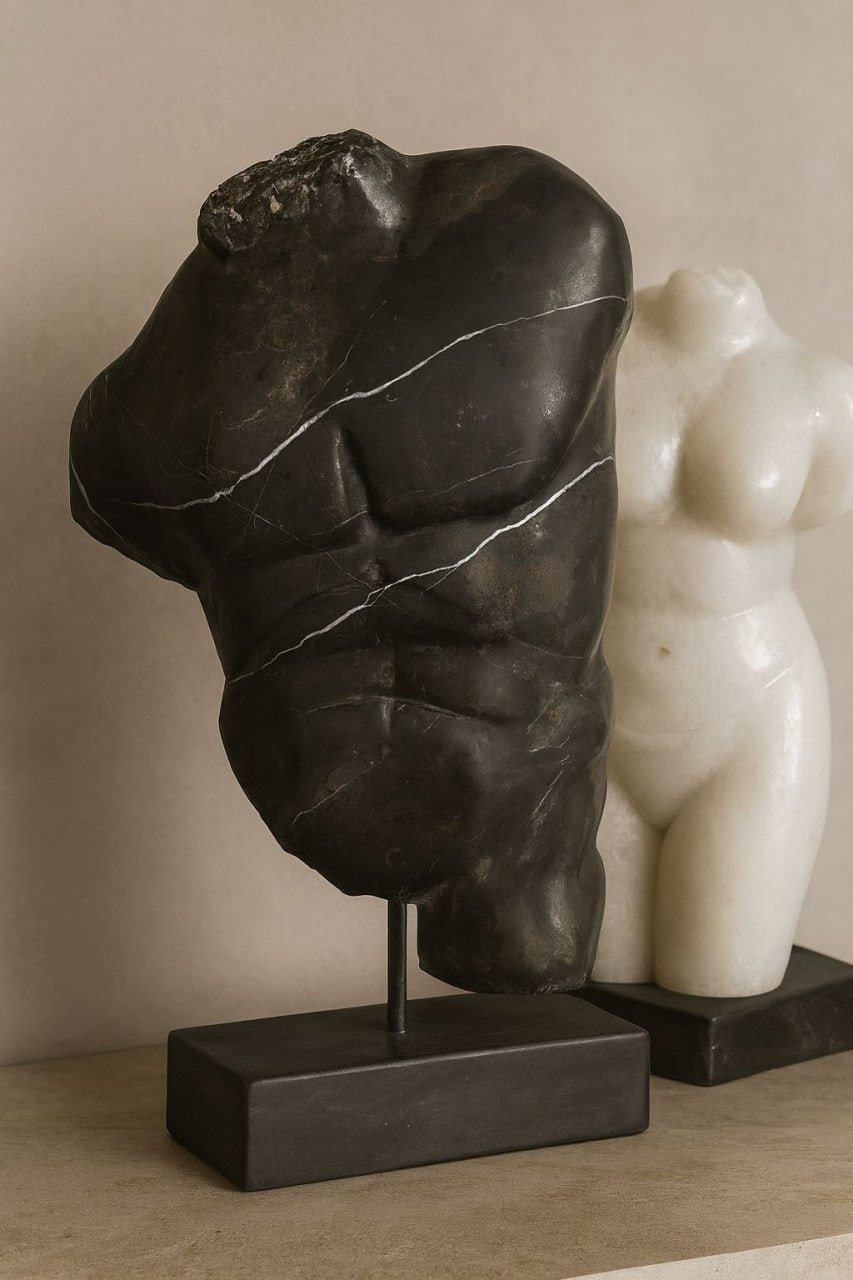 Escultura decorativa de tres eslabones entrelazados tallados en una sola pieza de mármol gris oscuro. Pieza que desafía la percepción del material, transformando la rigidez de la piedra en la fluidez de una cadena.