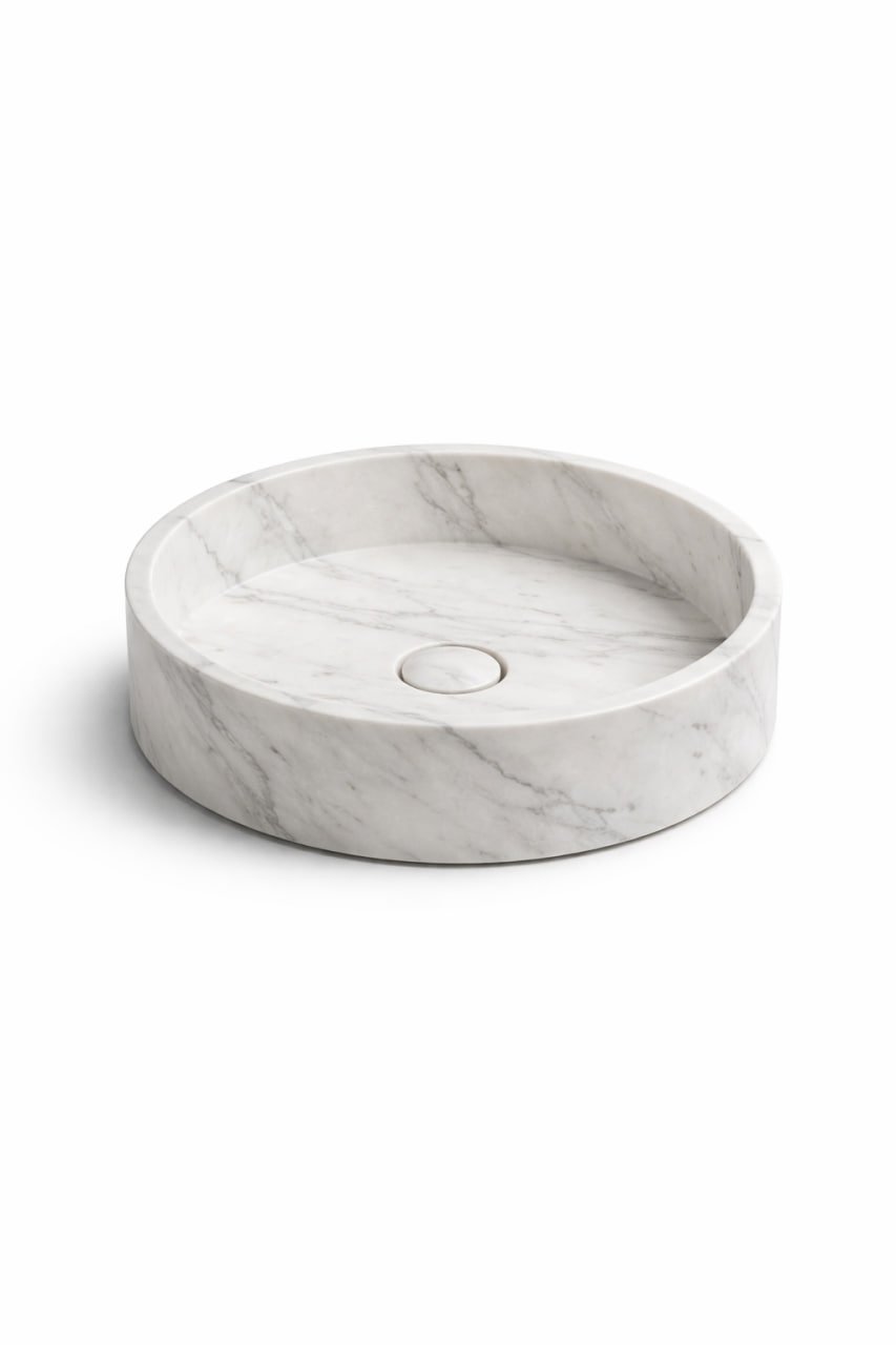 Lavabo circular de perfil bajo en mármol blanco Carrara con orificio central.