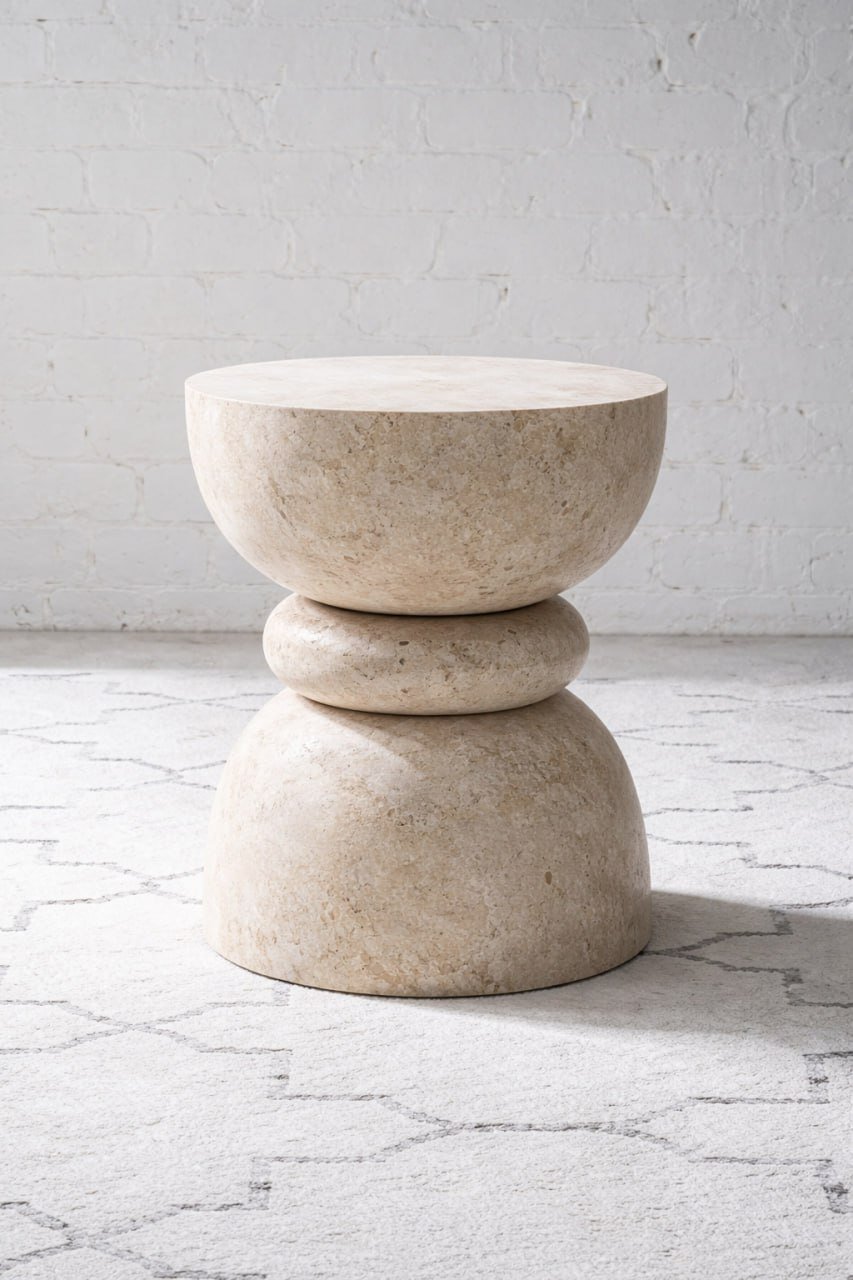Mesa auxiliar con silueta orgánica tipo reloj de arena, tallada en travertino natural. Diseño escultórico que funciona como mesa lateral o pieza decorativa. Acabado natural que resalta la textura porosa del travertino.