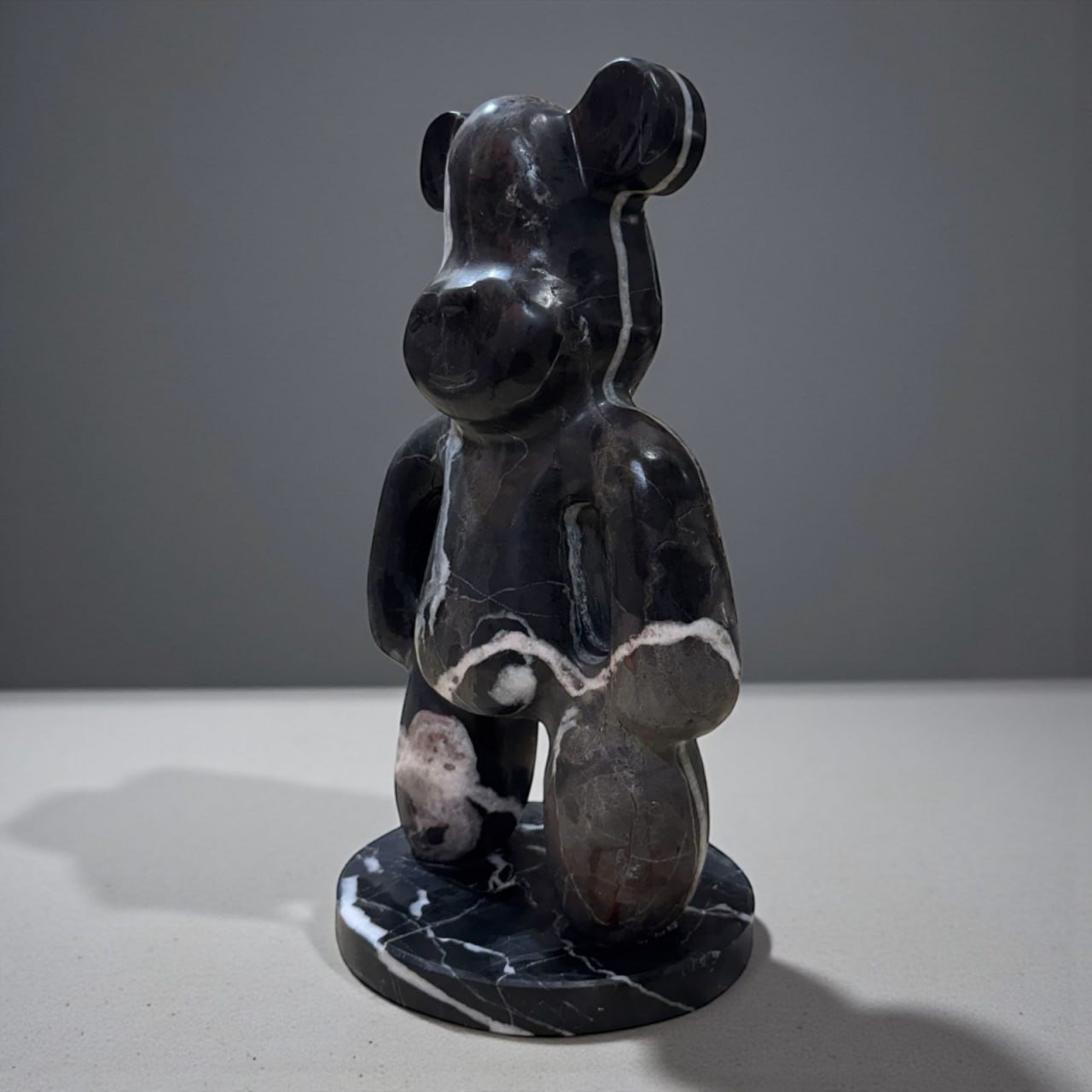 Escultura de oso tallada en mármol negro Marquina con vetas blancas naturales. Pieza de colección que combina arte pop contemporáneo con la nobleza del mármol. Base circular integrada.