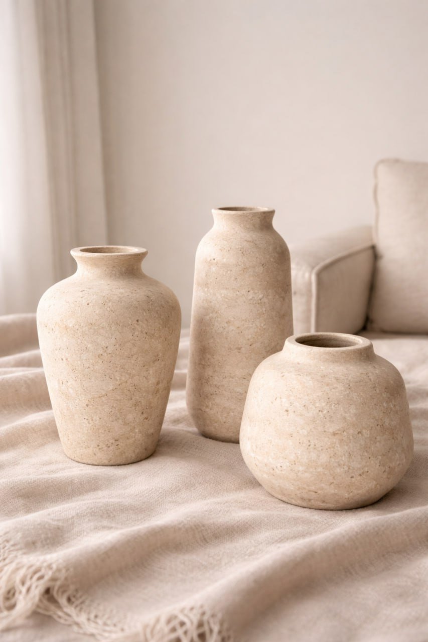 Colección de tres jarrones esculpidos en travertino natural. Cada pieza tiene una forma única: clásico, cilíndrico alto y esférico. Perfectos para crear composiciones decorativas en cualquier espacio.